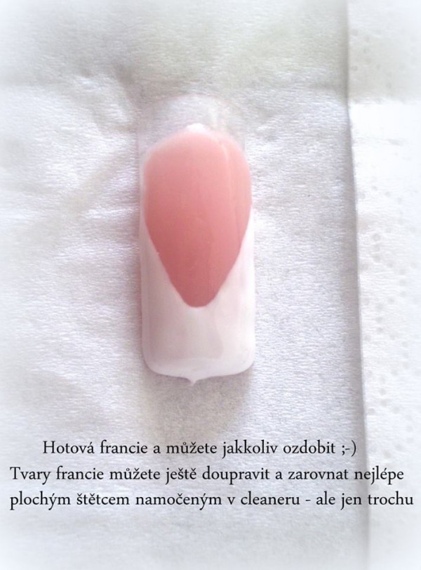 Existuje spousta návodů a způsobů, jak namalovat francii. Pro některé nehtařky je bílá francie noční můrou. Ale nemusí :) Stačí si pořídit kvalitní štětec, kvalitní bílý gel a několikrát si francii natrénovat. Někdo trénuje jen na tipy, někdo přímo na živé modelce. Spíše doporučuji druhou variantu. Je vždy dobré se domluvit s kamarádkou, ať Vám pomůže a nechá Vás si na ní trénovat.